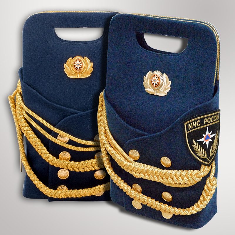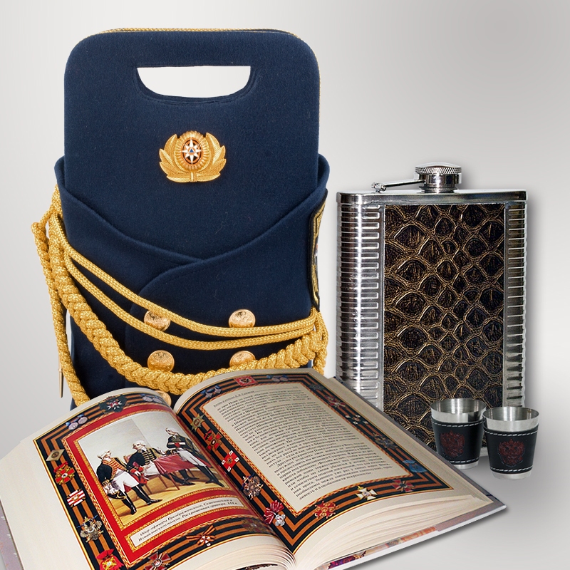 Подарочный набор "МЧС" — это оригинальный ведомственный подарок. Внешний вид упаковки (кофр) стилизован под современную униформу сотрудников спасательных служб России. Такой подход позволил придать подарку неповторимость и очень оригинальный вид. Кофр универсален, он может вмещать в себя любые подходящие по размеру подарки. Продукция уникальна, аналогов нет, это собственная разработка нашей компании. Набор включает в себя подарочный кофр из тонкого войлока, в нем подарочное издание книги "Россия. Наука побеждать" или "1812 год. Россия & Франция", стальную фляжку, две стальные стопки.