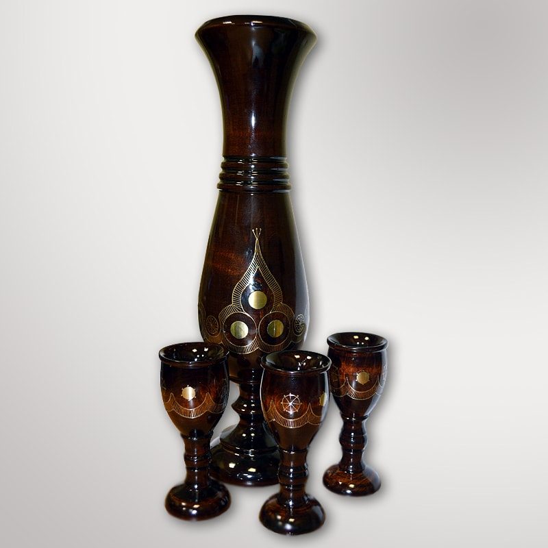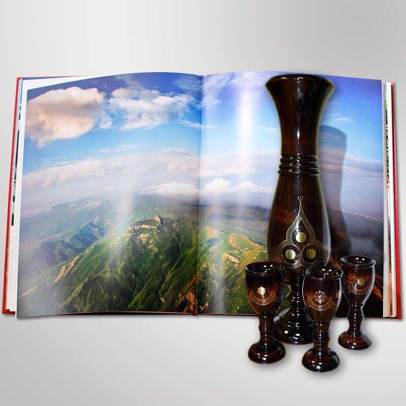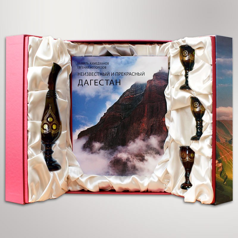 Книга помещена в стильный короб, в котором есть еще и подарочный набор унцукульских мастеров — изящная ваза и 3 рюмки, изготовленные вручную по старинной технологии. Унцукульские изделия из дерева — шедевры народного творчества, признанные во всем мире. Их изготоваливают из вишнёвого дерева, на поверхность которого наносят орнамент из серебряной проволоки - тысячи маленьких кусочков серебра мастер кропотливо вбивает в дерево, создавая орнаментальные рисунки, ставшие классикой элегантного декора. Унцукульские изделия - это великолепные интерьерные подарки, сделанные мастерами вручную по древней технологии, которой уже много сотен лет.