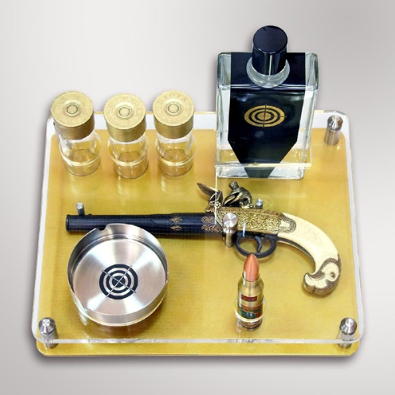 Подарочный комплект помещен в стильный деревянный короб, который исполнен как дуэльный футляр (очень удобно дарить). Возможности для персонализации набора — очень широкие. Надписи, логотипы и шильды могут быть нанесены на прозрачную поверхность столешницы, на штоф, пепельницу или крышку подарочного короба.