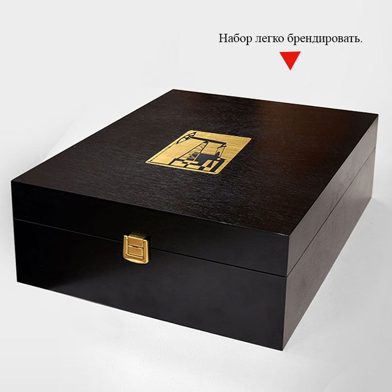 Набор можно брендировать, это делается быстро с помощью "золотых" металлопластиковых шильдов и лазерной гравировки.
