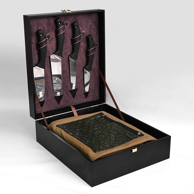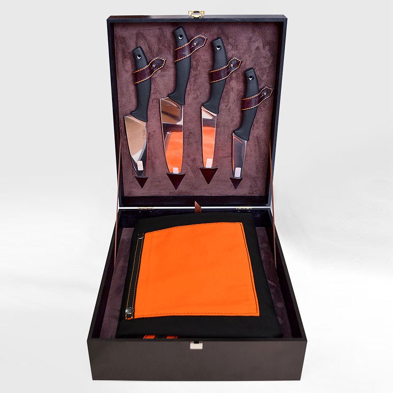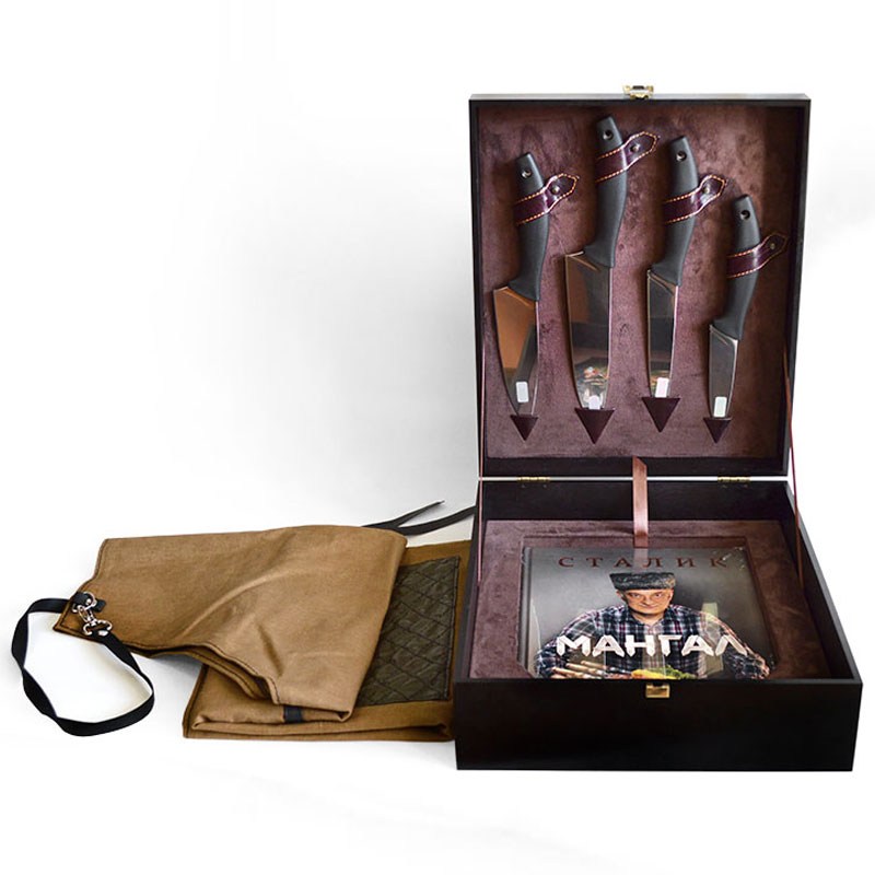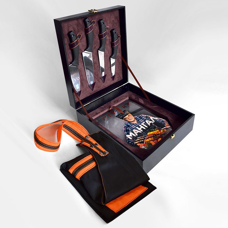 Рецепты от самого знаменитого кулинара России в цветном подарочном издании с шикарными фотографиями, 4 острых профессиональных ножа (все, кто легкомысленно  берут в руки, обязательно поранятся) – изготовлены на оружейной фабрике в Кизляре, и эксклюзивный фартук, который сшит так, что снимать его не хочется – а хочется нарезать, жарить и пассировать. Всё это в элегантном черном коробе, который можно брендировать.