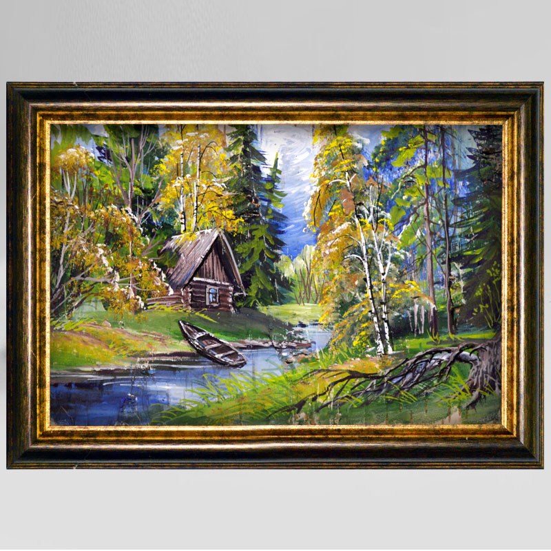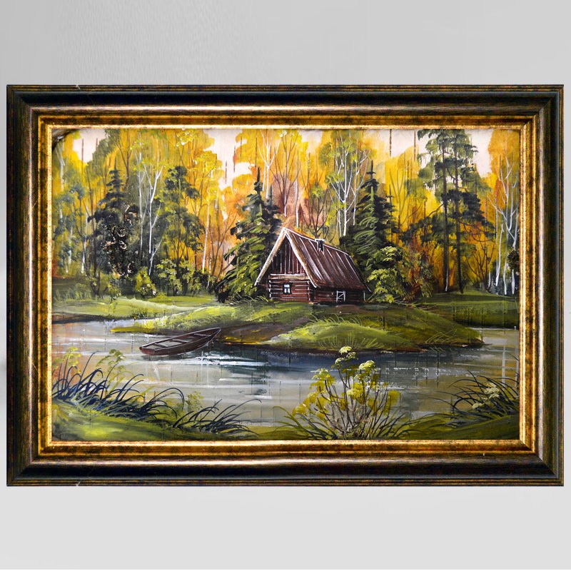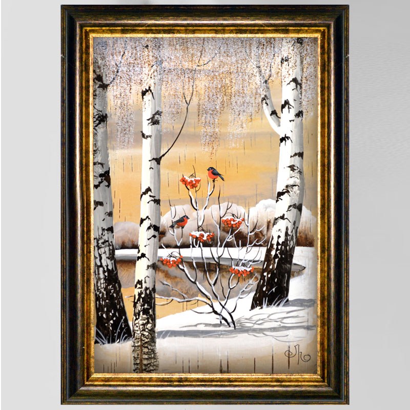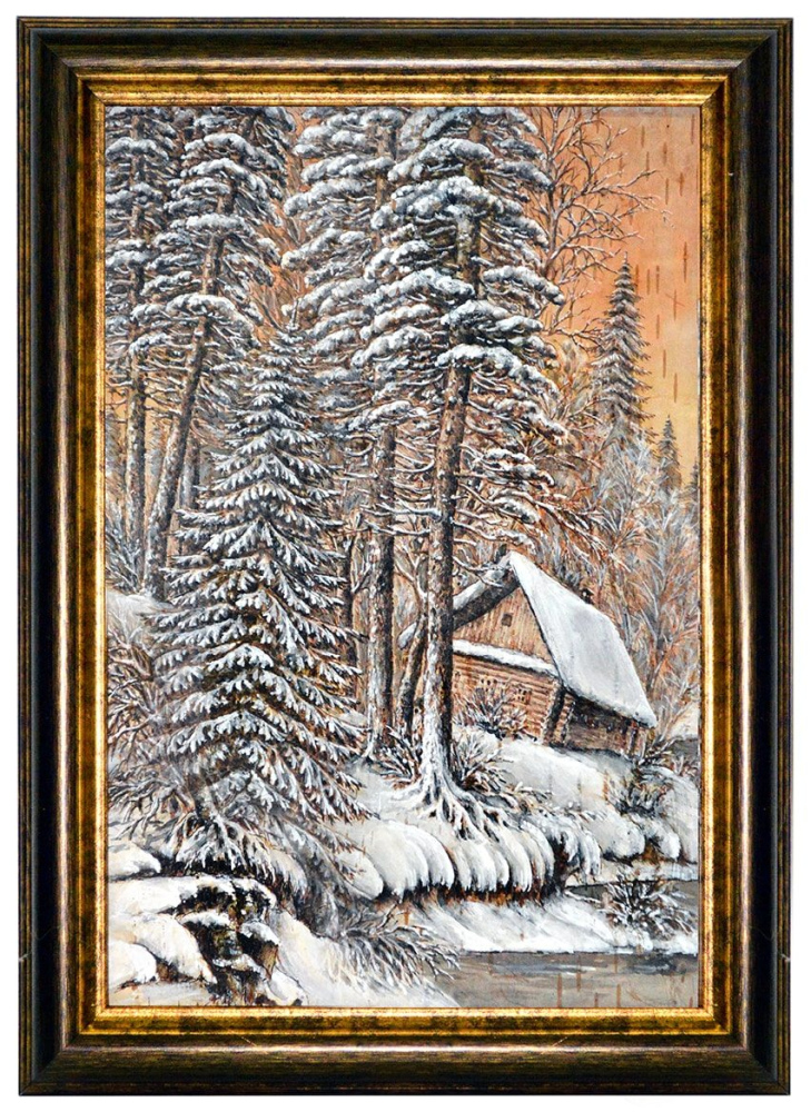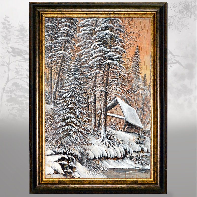 Картина на бересте, изображающая заповедные участки дремучей тайги.