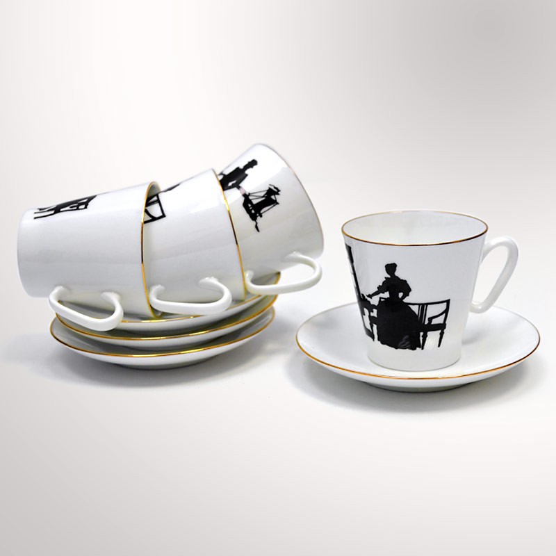 Кофейный набор изготовлен из костяного фарфора. Благодаря великолепному дизайну и высококачественному исполнению эта посуда сделает сервировку вашего стола элегантной и изысканной.