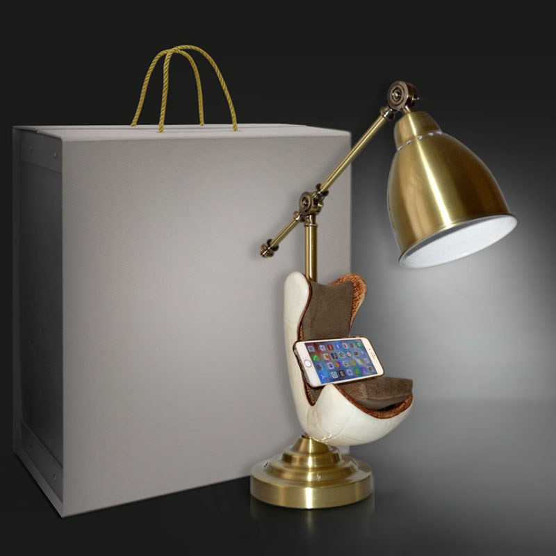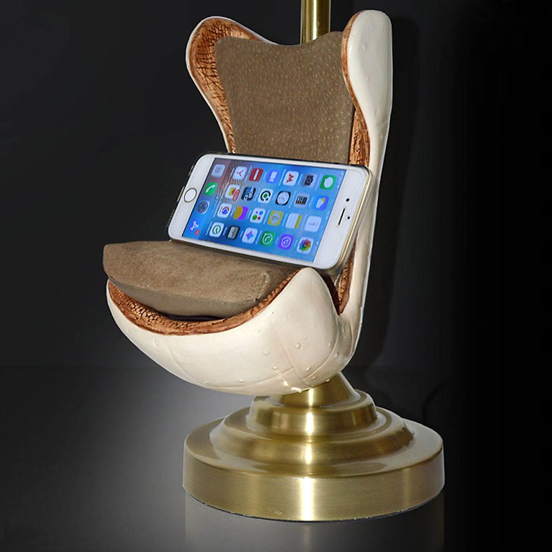 Лампа - предмет кабинетного интерьера. На рабочем столе теперь будет постоянное место для смартфона, он будет всегда перед глазами владельца, на удобной подставке в виде кресла. Вам будет комфортно смотреть видео на смартфоне - и в вертикальном, и в горизонтальном положении. А если понадобится зарядить ваше устройство - в "сиденье" кресла вмонтировано зарядное устройство стандарта Qi, совместимое с устройствами iPhone и Android. Обратите внимание - каждый смартфон имеет своё расположение магнитного модуля в корпусе, поэтому если на экране сразу не появился значок, отражающий процесс зарядки - просто подвигайте смартфон влево или вправо и процесс зарядки начнётся.