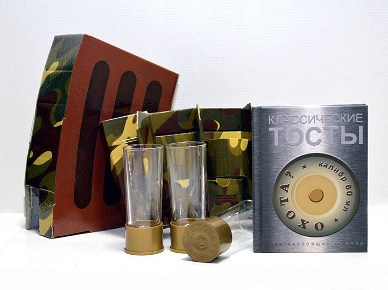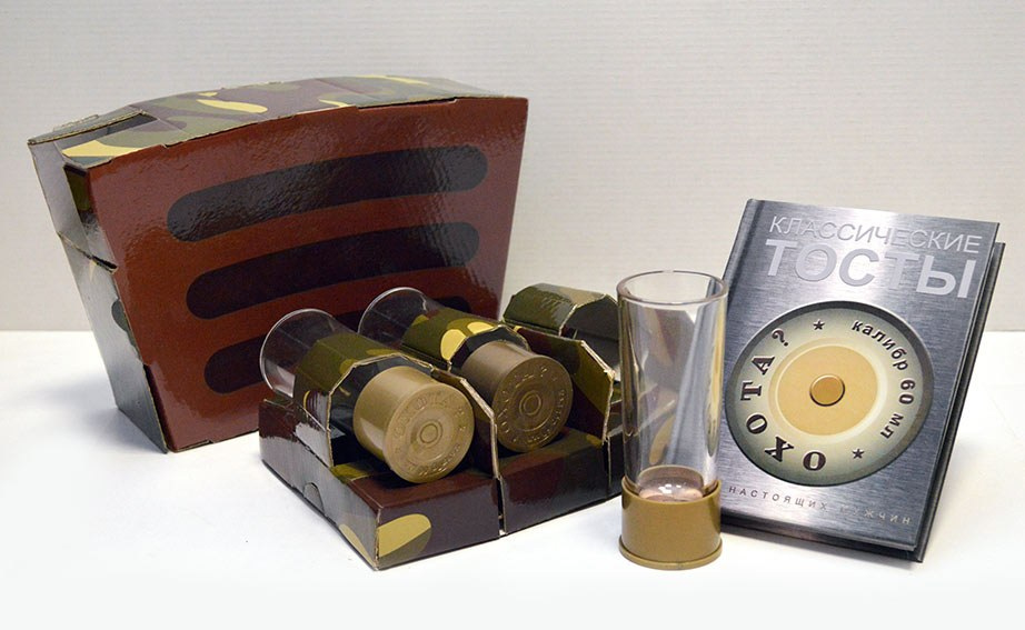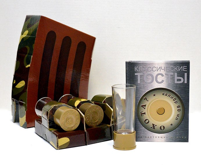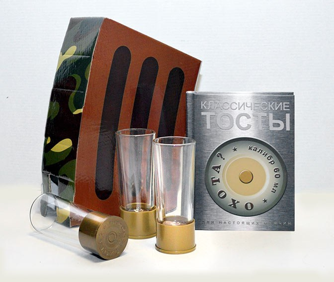 Недорогой бизнес-подарок, очень необычный.  В основе подарочного набора - три стопки-патрона. Стеклянные стопки из прозрачного стекла, с пластиковым донышком калибра 60 мл. Это отличный мужской сувенир. Недорого, компактно, прикольно и необычно. Этот сувенир - шутка, которую поймут только в России. Стопки в виде патронов, которые будут кстати в любом баре и за любым мужским застольем.